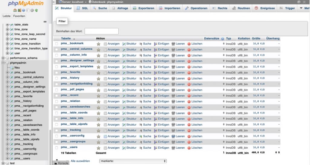 Auf der linken Seite werden alle Datenbanken angezeigt, die du erstellt hast. Hast du bisher nur eine einzige WordPress Installation auf deinem Webspace, dann wird dir in PhpMyAdmin auch nur eine Datenbank angezeigt.